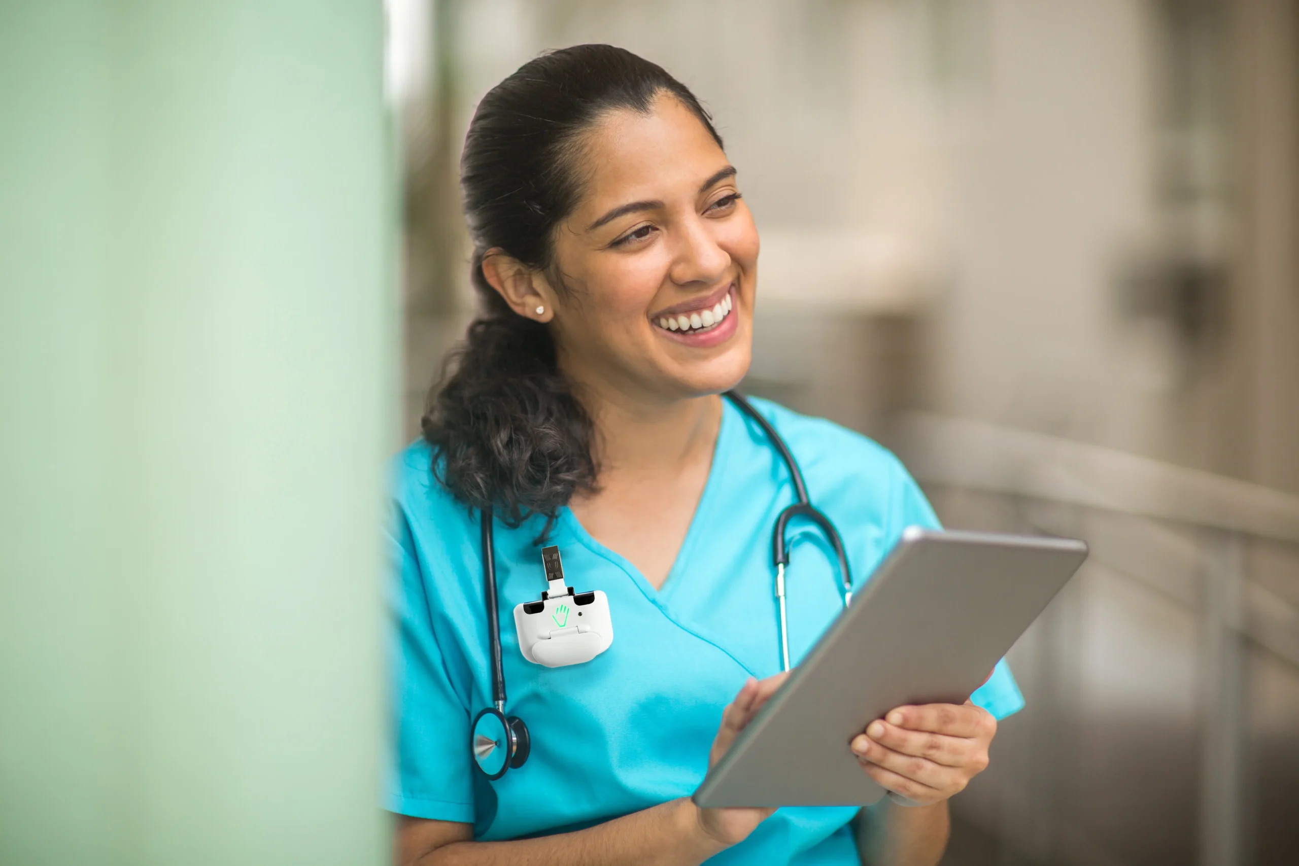 When a caregiver exits one patient room and enters another without performing hand hygiene, the badge issues an immediate alert through visual, audible, and vibration cues. This real-time prompt encourages corrective action before patient contact occurs. It helps reduce the likelihood of room-to-room transmission, which is one of the most common pathways for HAIs.